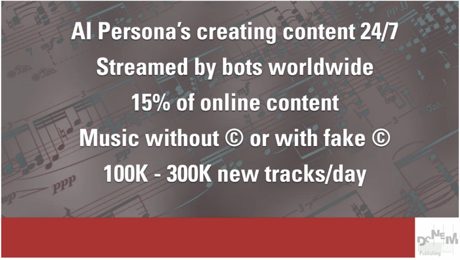 В качестве примера Даво ван Пеурсен привёл статистику распределения роялти по отраслям музыкальной индустрии в Нидерландах, используя данные общества по коллективному управлению правами BUMA. Тренд увеличения количества издаваемого музыкального контента может по его мнению вызвать снижение доходов артистам с параллельным ростом удельного веса сегмента функциональной музыки, доход от которой в зависимости от норм действующего законодательства может быть распределён между правообладателями продуктов генерации музыкальных нейросетей, статус которых необходимо будет установить.