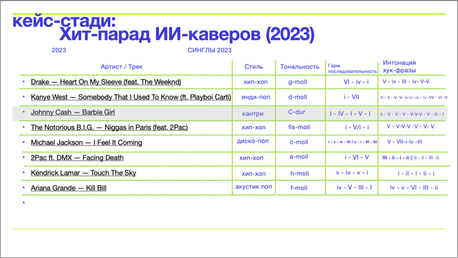 Представленный Евгенией Евпак на Третьем международном форуме молодых исследователей креативных индустрий, организованном ИСИЭЗ НИУ ВШЭ в ноябре 2023 г. кейс с расчётом убытков Дрэйка от генерации кавер-версии песни «Heart on my Sleeve» стал импульсом к созданию двух музыкально-поэтической композиции «Исследовательский киберпанк», в которой тестировались возможности по генерации музыкальных прототипов от ИИ-сервиса Suno в версии 3.1, значительно усовершенствованные нейросетью версии 3.5.