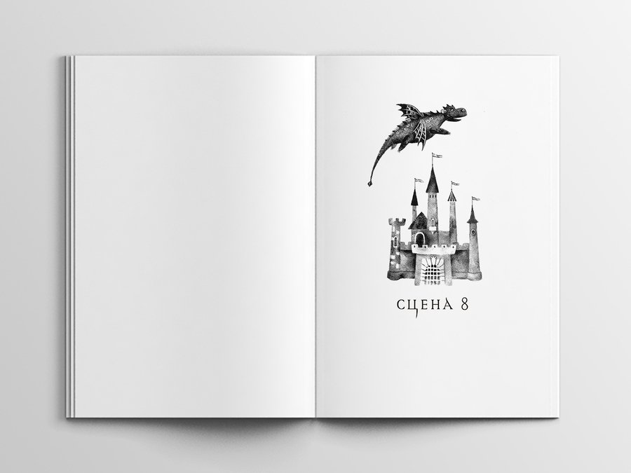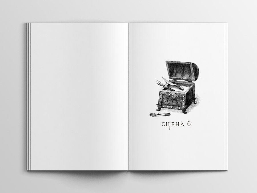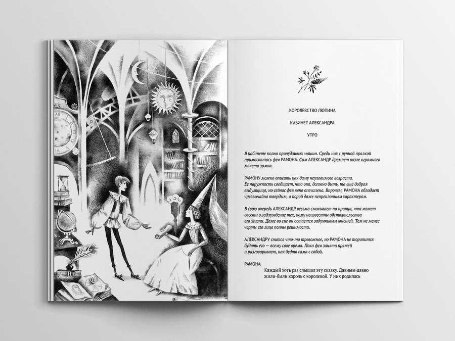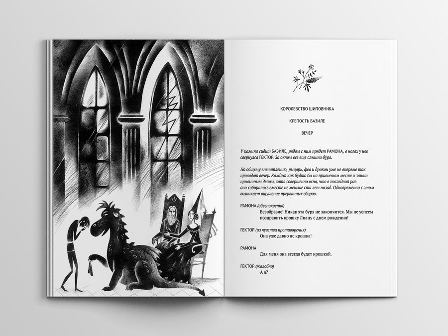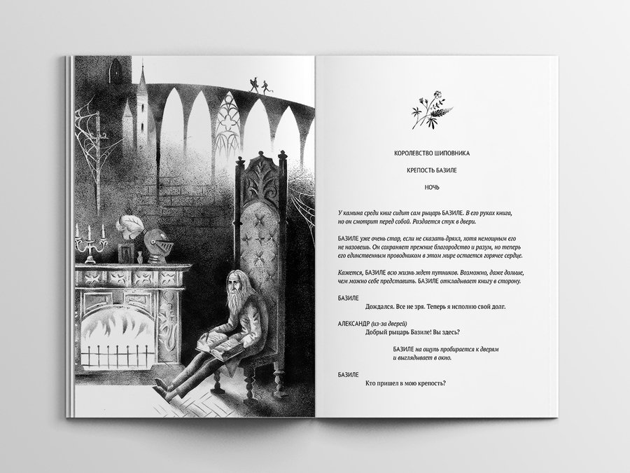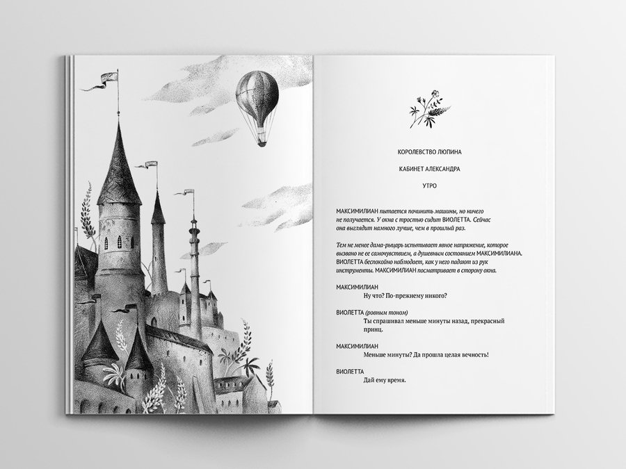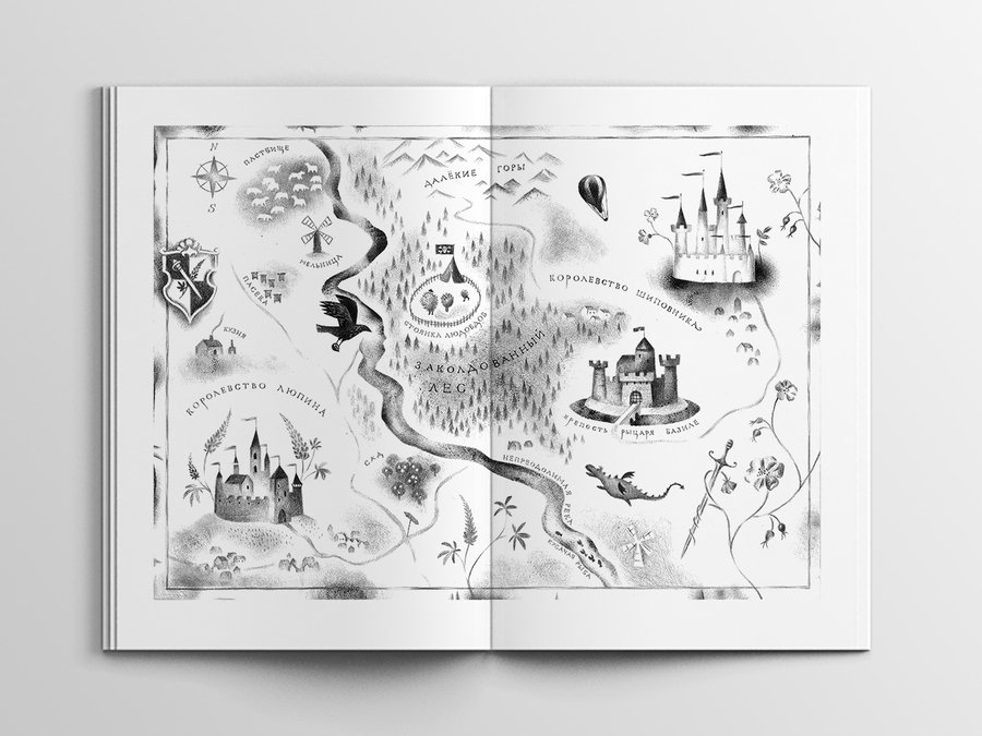 The world of the fairy-tale combines technical progress and wizardry. So it was important to accordingly illustrate inventions inspired by Leonardo da Vinci, as well as the magical aura of adventures and true love. The style of the illustrations refer to Medieval engravings. Their expressiveness is achieved through high contrast of silhouettes, textural saturation, and concise composition.