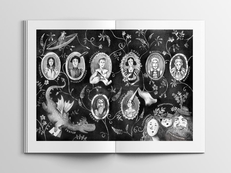 The book opens with two illustrated spreads: portraits of the characters designed as a family tree, as well as a map of the kingdoms foreshadowing the future adventures of the protagonists.