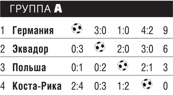 Настороженное отношение местной публики к немецкой сборной, которой руководил неофит Юрген Клинсман, сменилось восторгом после триумфального выхода из группы. Ставка на атаку себя оправдала — Германия вновь вошла в число претендентов на награды. В средней линии все нити игры сходились к опытному Михаэлю Баллаку, в атаке удачно взаимодействовали Клозе и Подольски, а в центре обороны постепенно осваивался Мертезакер. Команда показала отличное движение и стремление бороться до конца: Нёвилль забил победный гол в ворота поляков в добавленное судьей время.