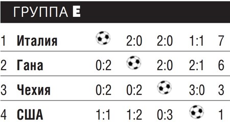 Однако в следующей игре с США «скуадра адзурра» внезапно столкнулась с проблемами. Итальянцы быстро повели в счете после удара Альберто Джилардино, но в середине первого тайма ухитрились забить в собственные ворота, потерять заслужившего красную карточку Даниеле Де Росси, а затем лишиться и травмированного Франческо Тотти. «Выручил» сборную Италии уругвайский арбитр Хорхе Ларрионда, удаливший на 45-й и 47-й минутах сразу двух американцев. Отметим, что оба наказания были абсолютно справедливыми. В заключительном матче в группе итальянцам не составило большого труда обыграть расстроенных чехов, к тому же понесших серьезные потери вследствие травм и дисквалификаций игроков.