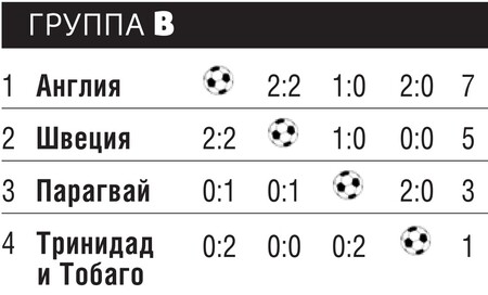 Сборная Англии натужно продвинулась в следующий этап, не показав впечатляющей игры в атаке. В первых двух матчах англичане с трудом добились побед, при этом всего один гол записал на свой счёт игрок атаки — нападающий Питер Крауч. Кстати, телевизионные повторы показали, что он забивал мяч в ворота сборной Тринидада и Тобаго с явным нарушением правил. Еще один мяч отправили в свои ворота парагвайцы уже на третьей минуте матча — Карлос Гамарра очень неудачно подставил голову под навес Бекхэма со штрафного. Вдобавок в самом начале поединка со шведами англичане потеряли Майкла Оуэна, который подвернул ногу на ровном месте. Несмотря на множество проблем, в заключительном матче группового турнира команда выглядела намного лучше, чем в начале. Наладилось взаимопонимание между полузащитой и атакой, вернувшийся после травмы Уэйн Руни порой демонстрировал былые умения, а отличившийся в двух матчах подряд полузащитник Стивен Джеррард почувствовал вкус к атаке.