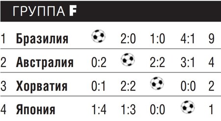 Самую крупную сенсацию турнира сотворил Гус Хиддинк, уже имевший в кармане подписанный контракт с Российским футбольным союзом. Руководимые им австралийцы сделали упор на игры со своими непосредственными конкурентами, не надеясь на удачу в поединке с бразильцами. Эта стратегия идеально сработала. В первом матче они внезапно обыграли японцев, уступая до 84-й минуты 0:1. Вырвать победу удалось благодаря решению Хиддинка пойти ва-банк, заменяя игроков обороны на форвардов. В конце концов эта авантюрная тактика сработала — попавшая под непрерывное давление физически мощных австралийцев оборона японской сборной рухнула. Матч с хорватами команда Хиддинка провела на подъеме и постоянно атаковала, причем изобретательнее футболистов Хорватии. Австралийцев нисколько не смутил тот факт, что соперник дважды вел в счете. Они оба раза отыгрывались и добились в итоге нужной для выхода в следующий круг ничьей.