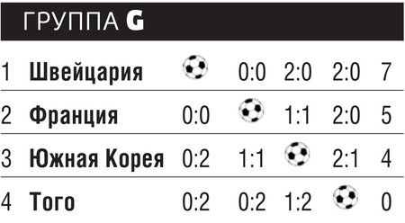 Французы, выставив на поле всех лучших, но возрастных игроков — самым юным в матче со Швейцарией оказался Франк Рибери 1983 года рождения — не сумели пробить оборону соперника. Атака явно буксовала из-за того, что тренер Раймон Доменек решил использовать схему с одним выдвинутым вперед форвардом — нападающим Тьерри Анри. Предполагалось, что игроки средней линии будут постоянно снабжать его передачами, но сразу наладить связи не удалось. Во втором матче с Южной Кореей Анри гол забил, но без всякого участия полузащитников: вратарь соперников отбил мяч ему на ногу после удара Вильтора. И только в заключительной встрече с Того, когда на кону стояла путевка в плей-офф, а Зидана не было на поле из-за дисквалификации за две желтые карточки, Доменек решился выпустить второго форварда. Это сразу же изменило ход матча: французы стали чаще создавать опасные моменты у чужих ворот, но неимоверно их транжирили. Во втором тайме усилиями Патрика Виейра сборная Франции дважды добилась успеха. Сначала полузащитник мастерски использовал хороший пас Рибери, затем сам выдал отличную передачу Анри.