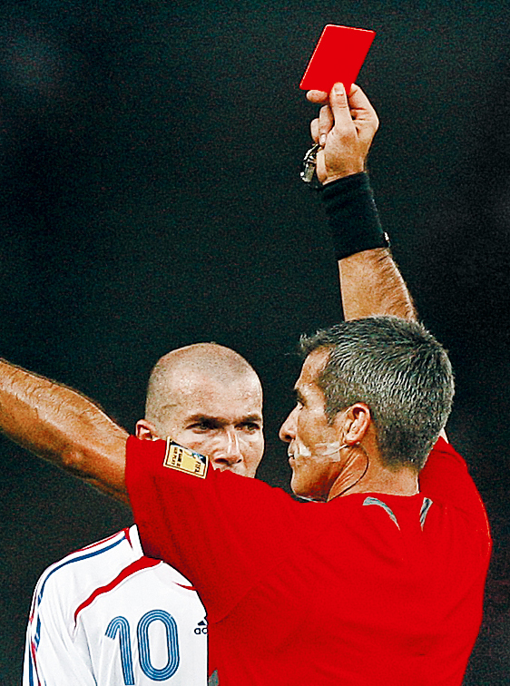 А на 110-й минуте все забыли про футбол, поскольку стали свидетелями драматического завершения карьеры великого Зидана. После короткого обмена фразами с Матерацци француз внезапно боднул соперника головой в грудь. Итальянец, естественно, изобразил адские муки, а Зидан увидел перед глазами красную карточку. По сей день неизвестно, что стало причиной нервного срыва у француза. Итальянец впоследствии вовсю эксплуатировал случившееся, даже выпустил книжку под названием «Что я на самом деле сказал Зидану», где содержалось 250 вариантов сказанного. Один из них, как утверждал автор, был правильным. Но это не добавило Матерацци популярности, в том числе среди коллег-футболистов. Многие и по сей день считают его поступок мерзким.