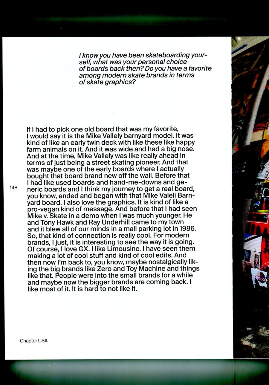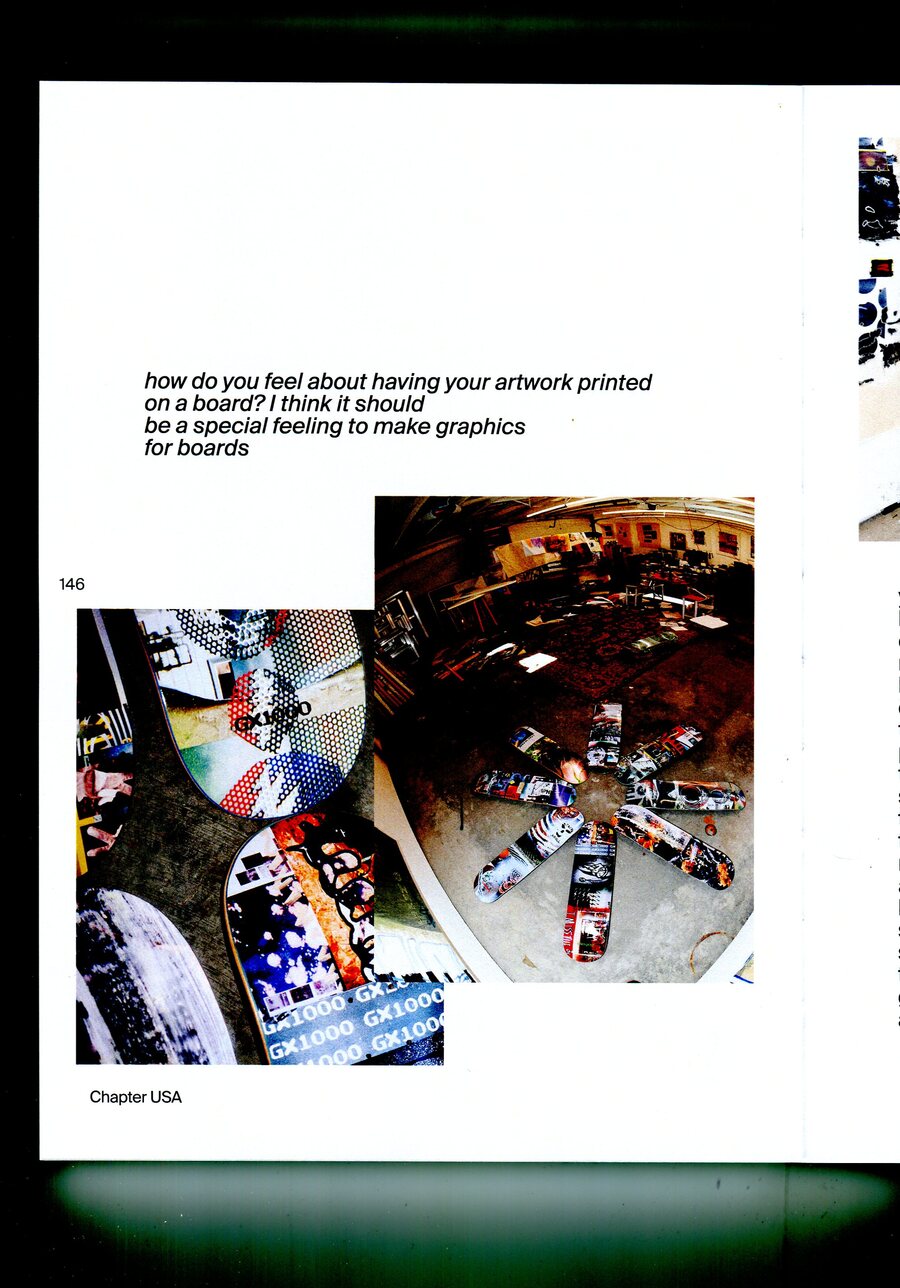 Кроме того, мне удалось взять интервью у шестерых художников, создававших скейт-графику. Я также был очень рад этим знакомствам — это были авторы из США, Китая и Великобритании. Хотя Ник Дженсен скорее известен как скейтбордист, а не художник.