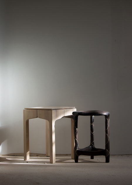 Идея этих табуретов возникла из первого абзаца Тургеневского «Хорь и Калиныч». Орловский мужик был невысок ростом, угрюм и сутуловат, ел плохо и носил лапти. Калужский мужик был высок ростом, опрятен, смотрел смело и весело, лицом бел и чист. В описании орловского мужика у меня возник образ нескладного табурета, с какими-то хаотичными царгами и в грубой обработке. Впоследствии образ орловского мужика был перенесен в материал практически без изменений, только добавилось плетение веревкой на ножках которые имитируют подвязку оборами онучей. С переносом в материал описания калужского мужика я зацепился за его описание «лицом бел и чист», поэтому за основу его дизайна взяты формы Владимиро-Суздальской архитектуры, в частности, церковь Покрова на Нерли.