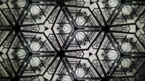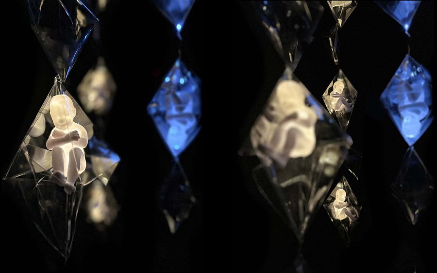 Инсталляция про волнение о будущем и надежду на него. Знак тотального контроля — бесконечно следящие глаза или камеры — физически неотделим от метафоры свободы — кротовой норы, позволяющей беспрепятственно перемещаться сквозь пространства.