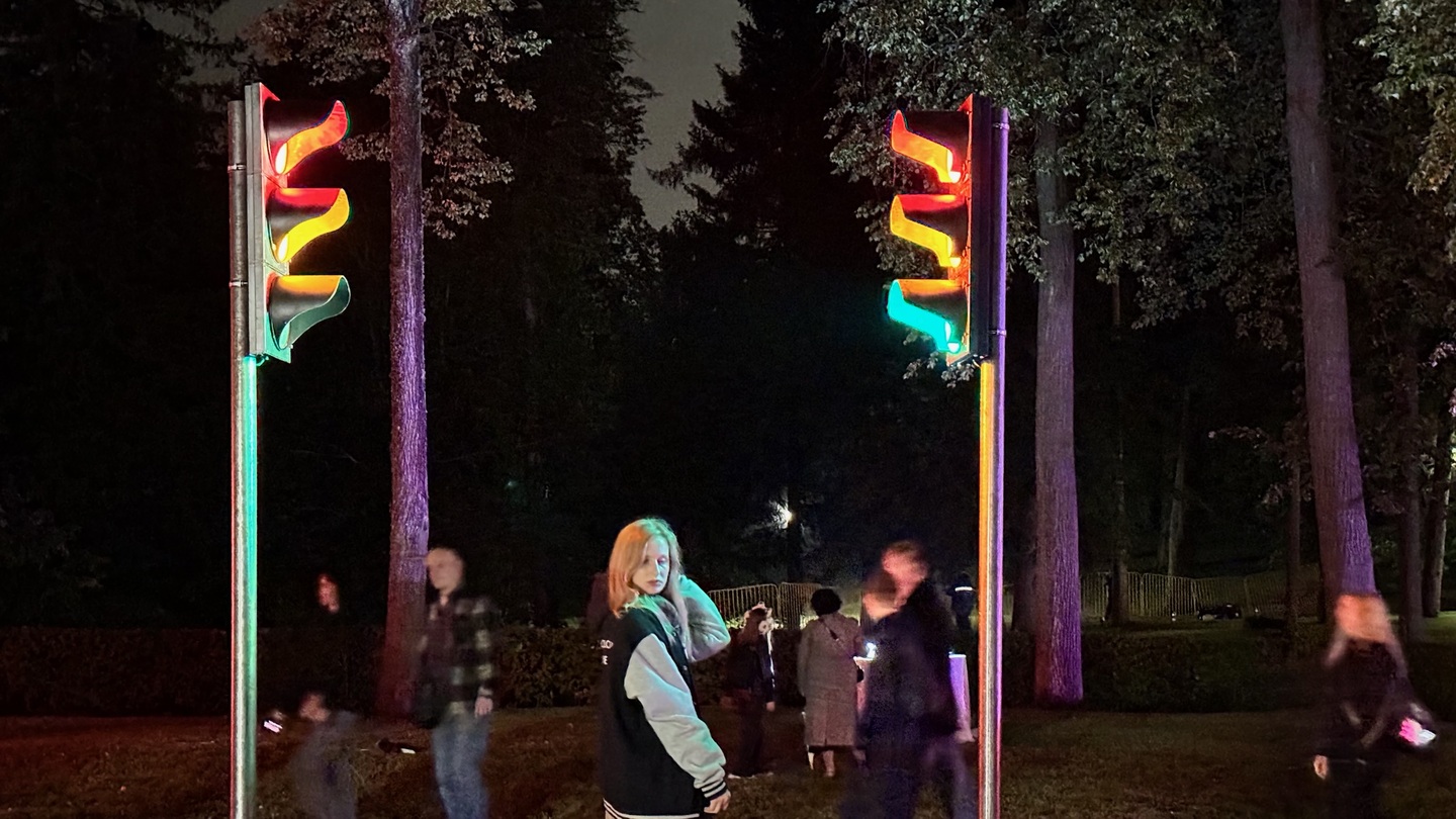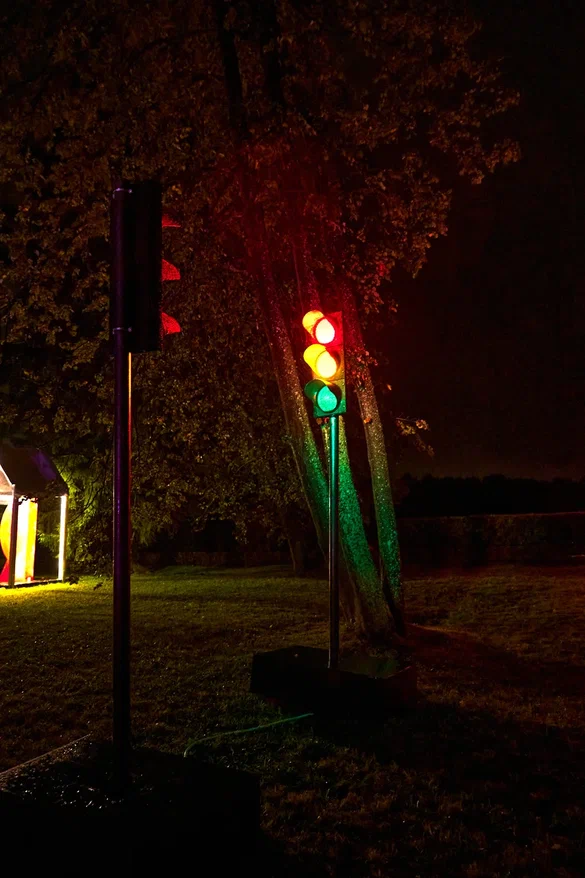 В глубине парка, среди деревьев, застыли два светофора. Они оказались вне своей привычной роли и теперь, оставшись без водителей и пешеходов, будто играют в людей. Они спорят. Свет — их голос, звучащий резко, перебивая собеседника, но иногда затухает, позволяя высказаться.