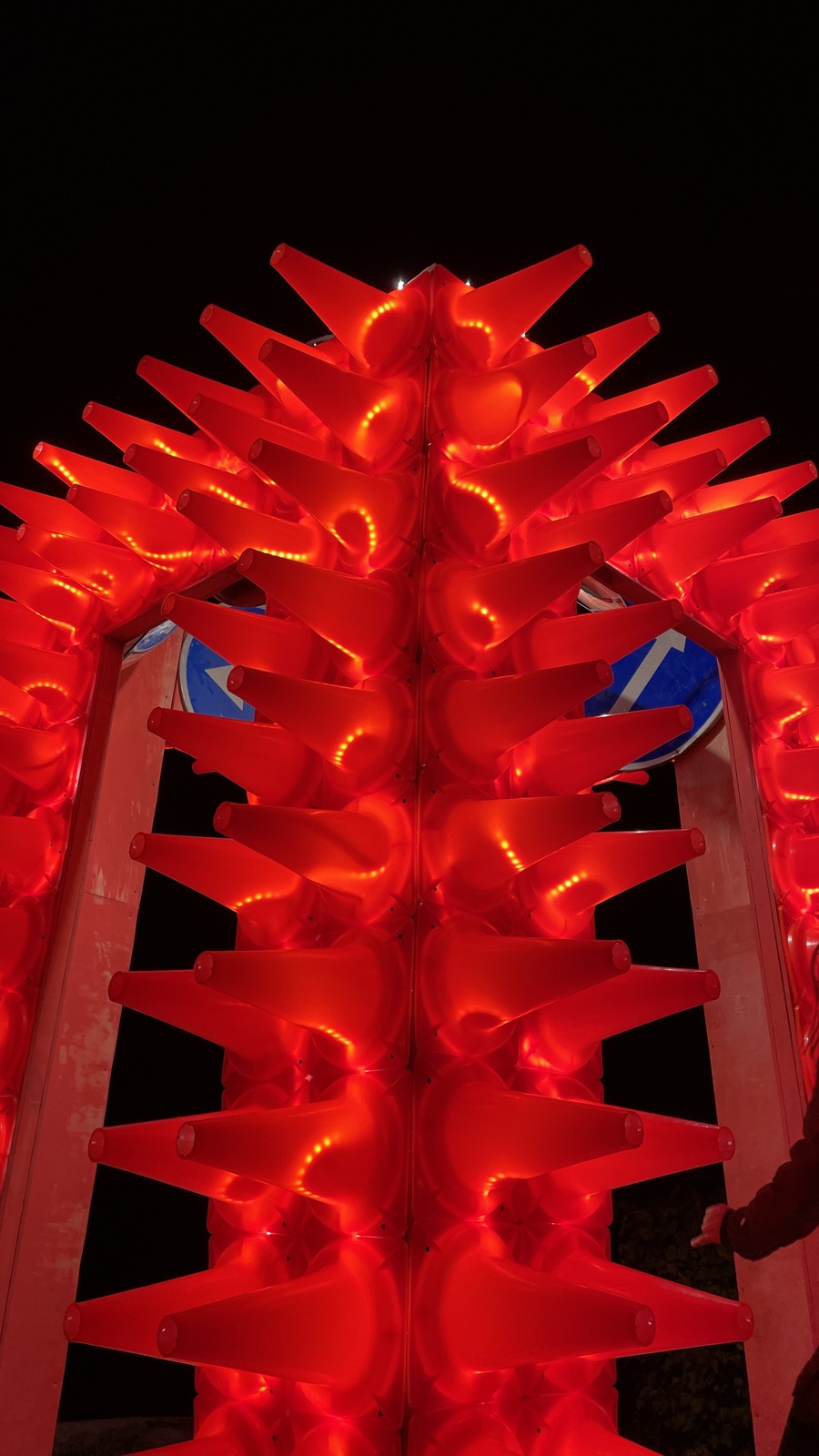 Будущее связано с прошлым так же, как взрослая жизнь с детством. Детские игры и развлечения — пространство радости — часто сопровождаются дорожными конусами, предупреждающими об опасности. Инсталляция «Warning!» передает эту двоякость и приглашает к интерактиву: зрителям могут вспомнить детство, поиграть среди конусов и, возможно, выиграть подарок.