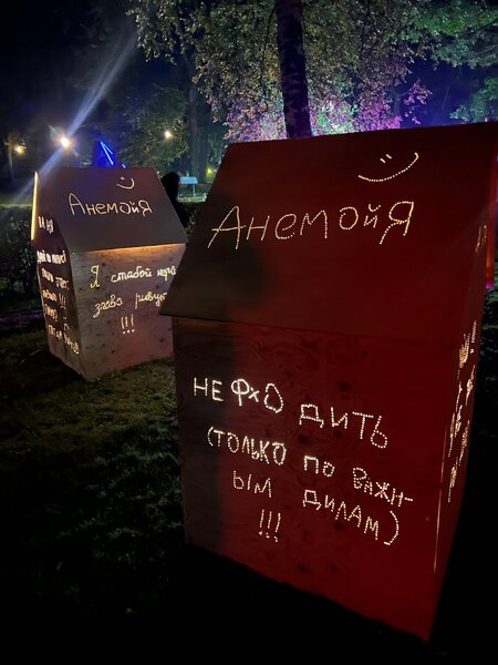Анемойя- феномен заразительной ностальгии. Инсталляция состоит из трех домиков. Два из них — украшены детскими надписями, которые светятся изнутри. Заразившись анемойей, каждый посетитель сможет с помощью специальных маркеров на третьем домике написать свою записку — фразы станут светиться в ультрафиолете! Это поможет пересмотреть свой взгляд на ситуацию или просто проявить себя.
