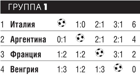 В матче с французами победу хозяевам обеспечил швейцарский судья Дюбак, назначивший очень сомнительный пенальти в ворота французов. Зато грубый прием против нападающего Сикса в штрафной аргентинцев в самом конце матча швейцарец не заметил. Качество игры аргентинцев улучшилось в последнем матче с Италией, от которого зависело лишь распределение первых двух мест — обе команды заранее вышли во второй раунд. Победитель оставался играть в Буэнос-Айресе, побежденный отправлялся на периферию в Росарио. Атака Аргентины была ослаблена отсутствием Луке, получившего легкую травму, и оставшийся в одиночестве Кемпес чувствовал себя не в своей тарелке. Цепкая оборона итальянцев не позволила хозяевам часто угрожать своим воротам, хотя на ничью они вполне могли рассчитывать. Исход матча решил удар Беттеги на 67-й минуте. Италия выглядела очень солидно и в атаке, и в обороне. Игроки отлично взаимодействовали друг с другом, имели огромный опыт игр в больших турнирах, но, как показало дальнейшее развитие событий, выплеснули слишком много сил, выбираясь из «группы смерти».