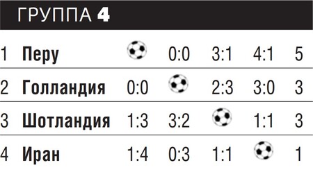 Команда Перу не в первый раз стала автором сенсации — в 1970 году сборная добралась до четвертьфинала. Но до начала турнира практически все были уверены, что из квартета во второй этап выйдут Голландия и Шотландия. «Оранжевые» подтвердили статус фаворитов, крупно обыграв Иран 3:0. Все три мяча — два из них с пенальти — забил Роб Ренсенбринк. В другом матче поначалу также все шло как положено — Джордан вывел Шотландию вперед на 14-й минуте. Однако на 43-й минуте перуанцы сравняли счет — Куэто послал мяч в ворота Рафа после паса игравшего еще в 1970 году Кубильяса. Звездный час ветерана наступил во второй половине встречи, когда 29-летний форвард на протяжении шести минут забил два гола-близнеца в верхний угол. Шотландцы и их болельщики испытали настоящий шок от поражения.