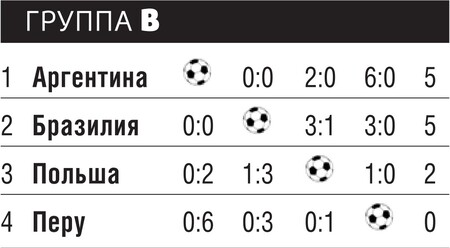 Бразильцы, к примеру, не смогли — обе команды в очном матче больше пеклись о безопасности собственных ворот, при первой возможности срывая атаки за счет мелкого фола. Трехкратные чемпионы мира были убеждены, что решили задачу выхода в финал, поэтому в последнем матче с Польшей ограничились тремя голами. Последний мяч, забитый Роберто, запомнился обилием предшествующих ему ударов: в штангу, в перекладину, снова в штангу! Польские защитники и вратарь Кукла наблюдали за происходящим как статисты. Теперь оставалось лишь дожидаться игры аргентинцев, которая по решению оргкомитета начиналась через 45 минут после окончания матча Бразилия — Польша. Хозяевам, для того чтобы выйти в финал, надо было побеждать со счетом 4:0. Мало кто верил, что это удастся. На первых минутах матча перуанцы выглядели намного лучше перенервничавшей сборной Аргентины. Прорвавшийся справа Муньянте даже успел попасть в штангу. Но затем под напором взявших себя в руки аргентинцев перуанцы сломались. К перерыву счет был 2:0 — отличились Кемпес и Тарантини, к финальному свистку — 6:0. Нужный результат был достигнут — хозяева вышли в финал.