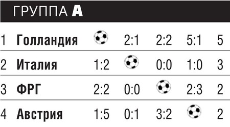 Матч с Германией оказался намного сложнее для голландцев, поскольку на этот раз немцы не стали отсиживаться в обороне. В одной из первых атак Абрамчик открыл счет, но затем голландцы перехватили инициативу. На 35-й минуте Ари Хан мощнейшим дальним ударом прервал «сухую» серию голкипера Майера, не пропускавшего мячей с первого дня турнира. Во втором тайме обе команды продолжали атаковать и забивать голы. Результат 2:2 устроил в первую очередь голландцев. Поединок Италии и Голландии превратился в досрочный финал — в нем должен был определиться один из участников решающего матча. Итальянцы доминировали в первом тайме, голландцы перехватили инициативу во втором. Они задушили соперника прессингом, заставили его постоянно ошибаться, лишили «скуадру адзурру» пространства для маневра. Другое дело, что в непосредственной близости от своих ворот итальянцы играли очень строго. Тогда голландцы прибегли к испытанному приему — обстрелу ворот с дальней дистанции. Им удались два великолепных даль них удара, которые Дзофф взять никак не мог. 2:1 — Голландия в финале.
