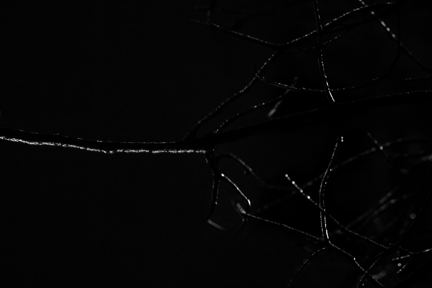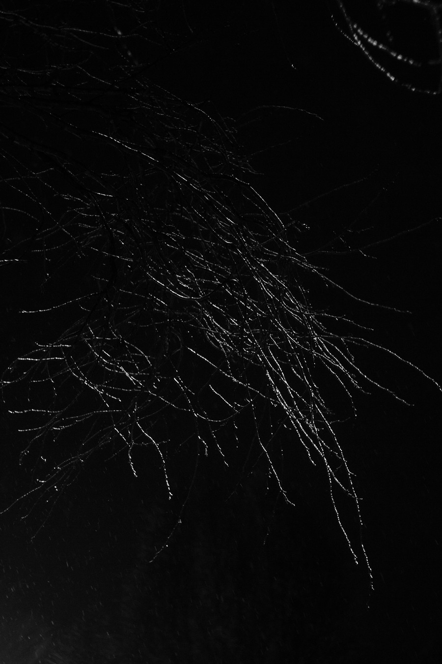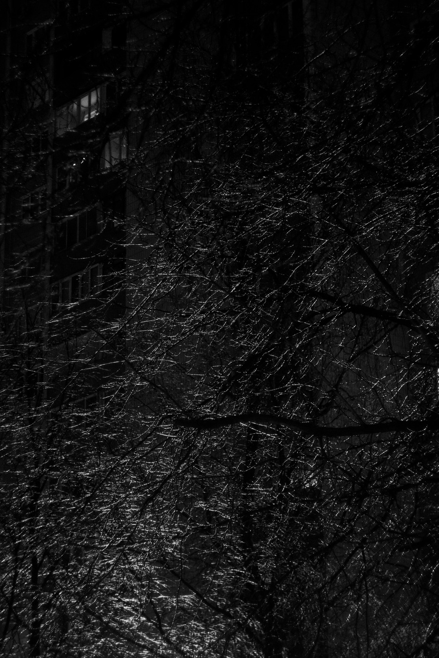 Ветки-провода-гирлянды. Канун китайского Нового года. У природы торжество, ночью в феврале тоже бывает светло. Монохром здесь для чтения дихотомии: ветвления (у природы); добра, зла и других дуальных проявлений (у нас). Мы подобны ей, и сами подобны друг другу.
