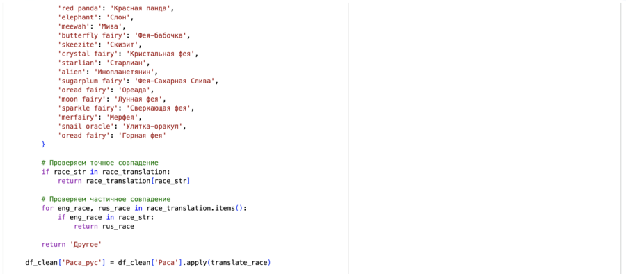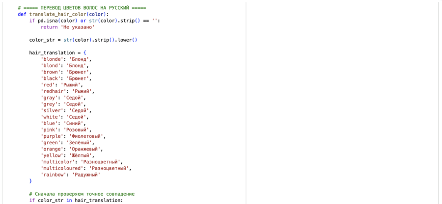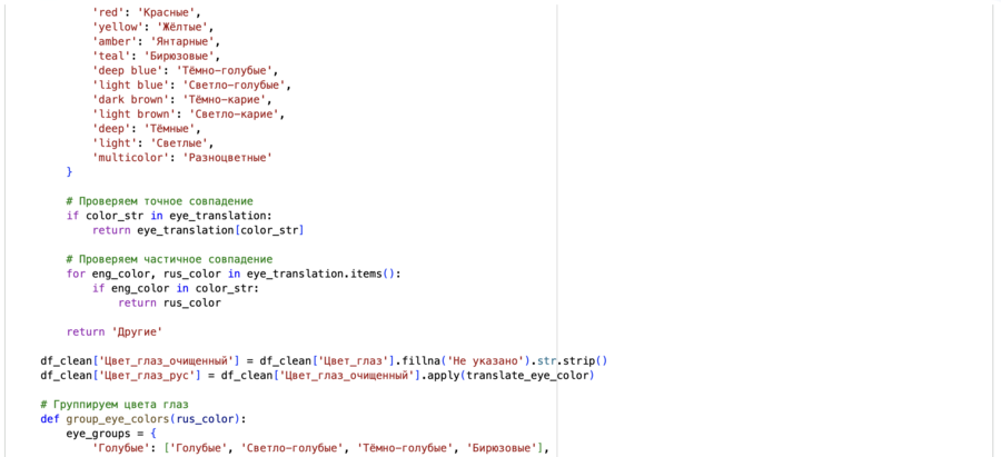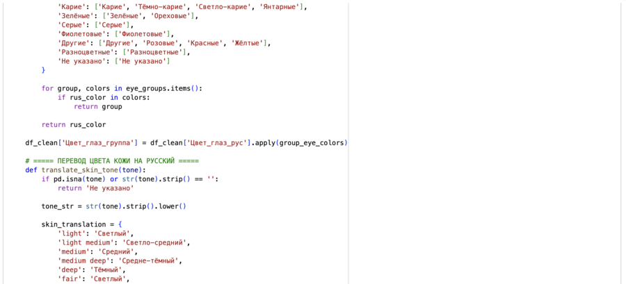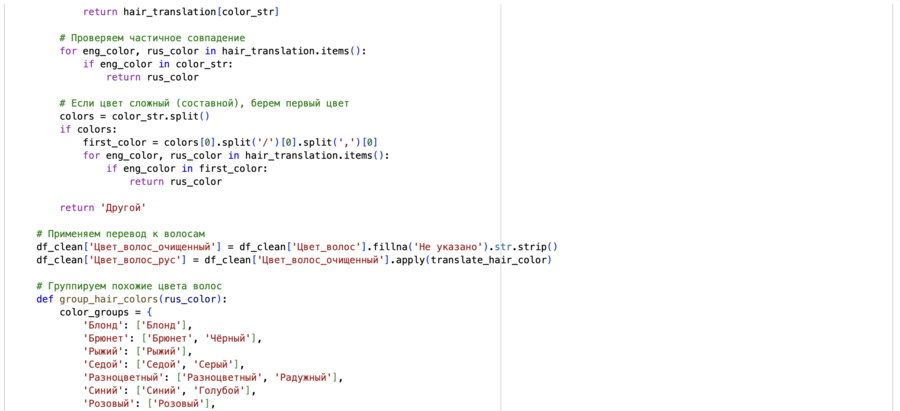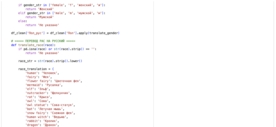 На этом этапе создаём рабочую копию данных и приводим названия колонок к русскому языку для удобства анализа. Переводим ключевые характеристики персонажей — пол, расу, цвет волос, глаз и кожи — на русский язык и группируем похожие значения. Это позволяет стандартизировать данные и подготовить их к визуализации и дальнейшему анализу.