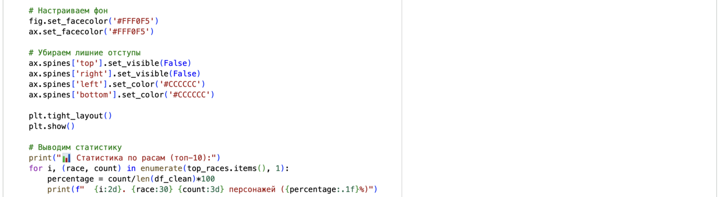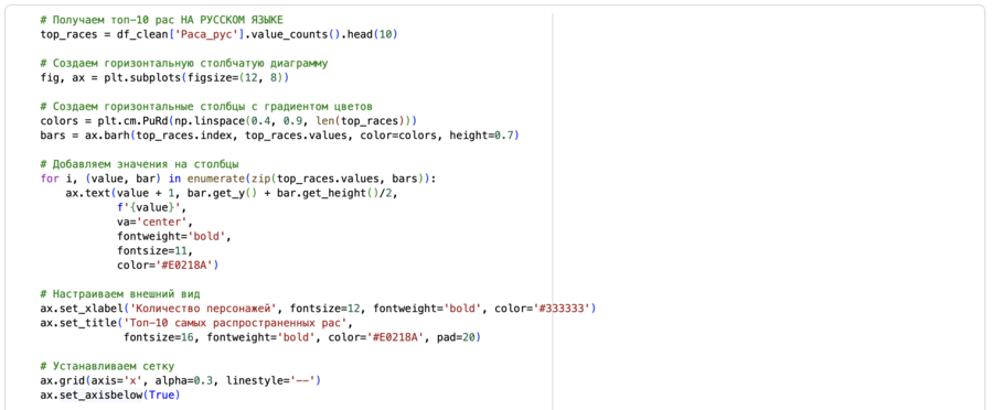 На этом этапе анализируем расовое разнообразие персонажей. Создаём горизонтальную столбчатую диаграмму, показывающую десять наиболее часто встречающихся рас. Визуализация позволяет наглядно оценить, какие расы представлены чаще всего, а также их количественное и процентное соотношение среди персонажей.