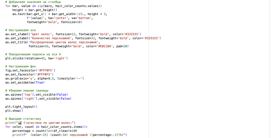 На этом этапе анализируем цвета волос персонажей. Создаём столбчатую диаграмму с индивидуальными цветами для каждого типа волос, показывающую количество персонажей в каждой категории. Визуализация помогает наглядно оценить популярность разных цветов волос среди персонажей и выявить преобладающие оттенки.