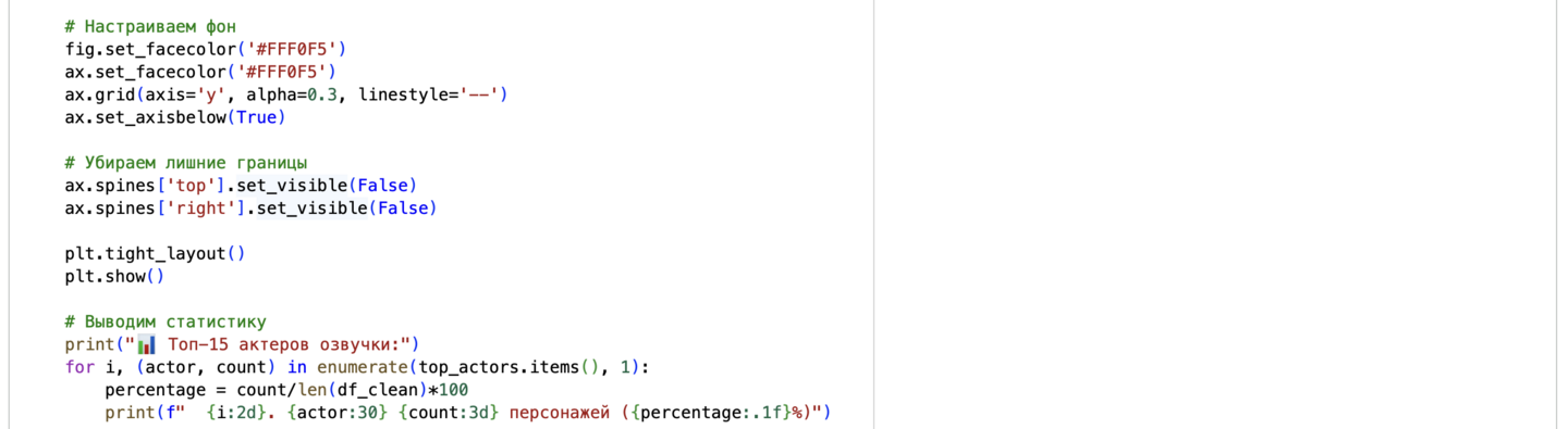 На этом этапе анализируем, какие актёры озвучивали наибольшее количество персонажей. Строим столбчатую диаграмму, показывающую топ-15 актёров, с указанием количества персонажей, которые они озвучили. Визуализация позволяет наглядно оценить нагрузку актёров и их вклад в проект.