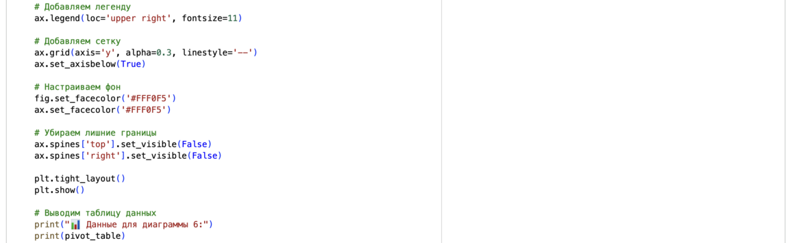 Для визуализации результатов анализа были использованы несколько типов графиков, каждый из которых решает свою аналитическую задачу и позволяет наглядно интерпретировать данные.