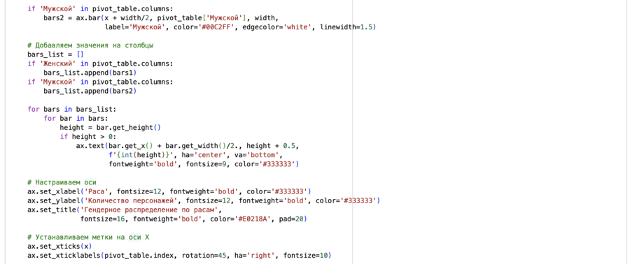 На этом этапе анализируем распределение персонажей по полу внутри наиболее распространённых рас. Строим группированную столбчатую диаграмму, которая показывает количество мужских и женских персонажей в каждой из восьми топ-рас. Визуализация позволяет выявить закономерности и дисбаланс гендерного распределения среди разных рас.
