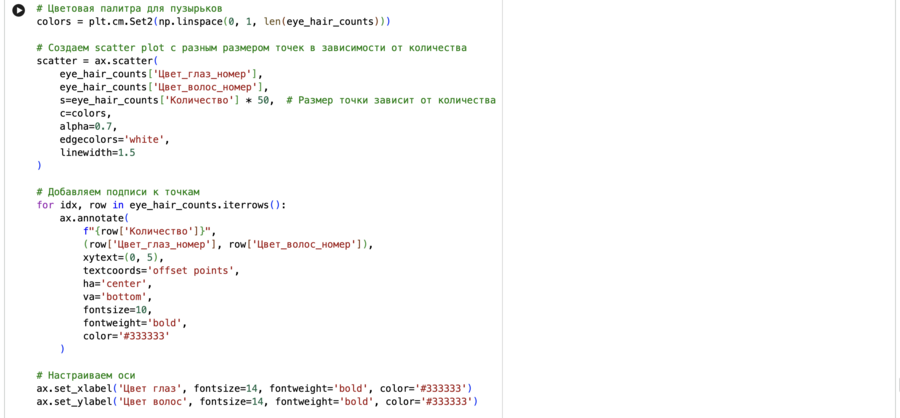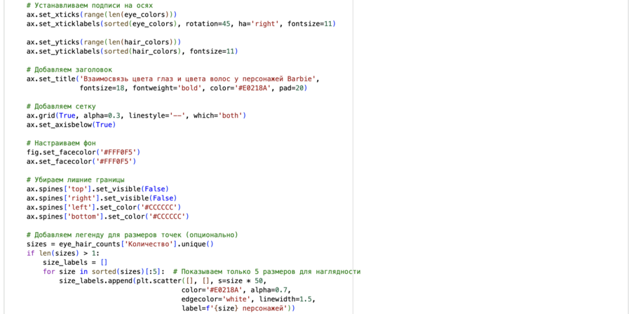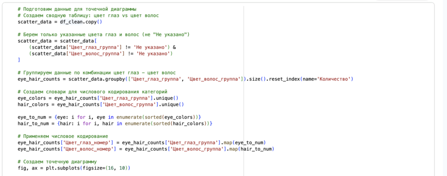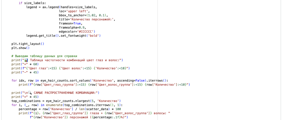На этом этапе анализируем сочетания цвета глаз и цвета волос персонажей. Создаём точечную диаграмму, где размер точек отражает количество персонажей с конкретной комбинацией. Визуализация позволяет выявить наиболее распространённые сочетания и изучить закономерности внешнего облика персонажей.