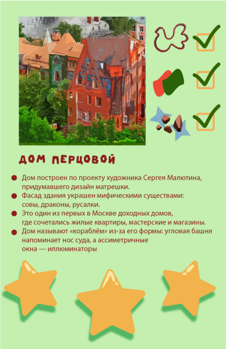 После оценки на карточке появляется краткий текст о здании, по которому создавался пряник. Карточка отправляется на стену, тем самым добавляет пряник в коллекцию уровней.