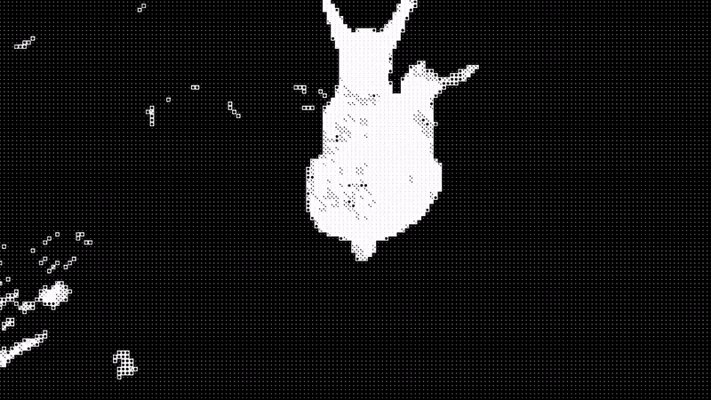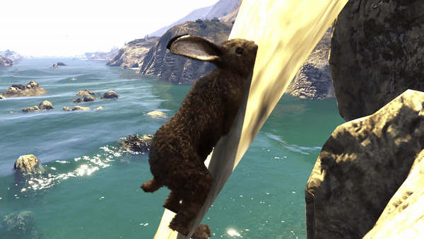 В видеоигре Grand Theft Auto V можно играть от лица кролика. Я документирую процесс управления им: кролик застревает в текстурах гор, искажается в воде, прячется среди растений и людей. Силуэт оказывается искажённым, неполным.