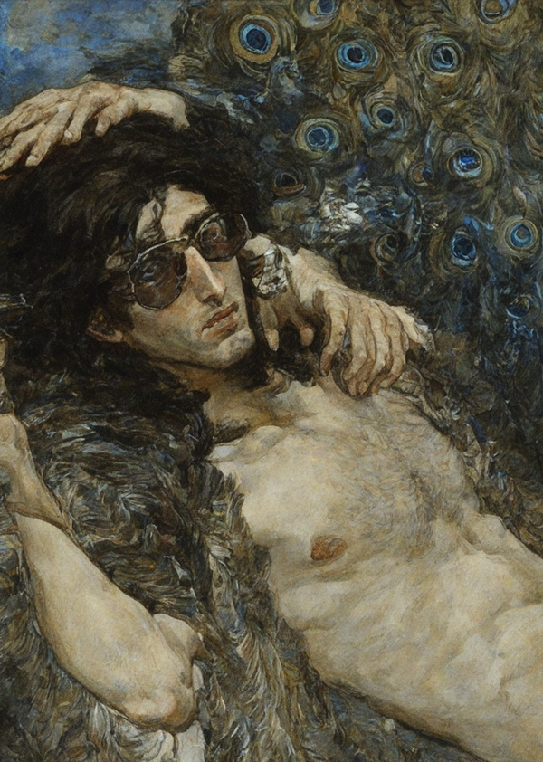 prompt = «painting in VRUBEL style, a young man is lying on peacock feathers, covering his forehead with his hand, long hair, dark eyes, blue shades, detailed, high quality»