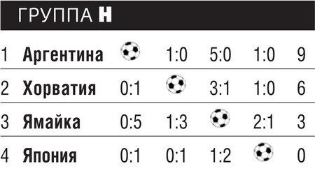 Благодаря неудержимым аргентинцам родилась знаменитая песня группы «Чайф»: «Какая боль, какая боль, / Аргентина — Ямайка — 5:0!» Бело-голубые атаковали стремительно и размашисто, а нападающий Батистута стал одним из лучших бомбардиров всего чемпионата мира. Сборные Ямайки и Японии оказались не в состоянии конкурировать с фаворитом. Боеспособные хорваты все-таки попытались бросить вызов южноамериканцам, хотя очный матч оторвавшихся от преследователей лидеров ничего не решал. Аргентина победила за счет единственного гола Пинеды, мяч к которому отскочил после неудачной попытки Звонимира Бобана прервать пас на ход аргентинскому нападающему.