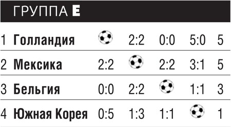 Миролюбиво относившиеся друг к другу лидеры дружно вымещали злость на корейцах, тренер которых Бум Кун Ча был уволен после разгрома, учиненного команде голландцами. «Оранжевых» под руководством Гуса Хиддинка в этом матче невозможно было остановить. Голландцы уверенно начали и заключительную встречу с мексиканцами, но, забив в первые 18 минут два гола, решили сэкономить силы. А вот мексиканцы, воодушевленные тем, что южнокорейцы сравняли счет в матче с Бельгией, внезапно включили скорость и прибрали игру к рукам. Гол, забитый Эрнандесом на четвертой добавленной минуте, вывел сборную Мексики во второй раунд, где ее ожидала встреча с Германией.