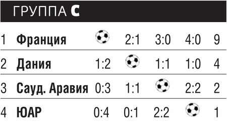 В матче с Францией датчан вполне бы удовлетворила и ничья, но они уступили со счетом 1:2, показав вялую и начисто лишенную фантазии игру. На их счастье сборная ЮАР не смогла победить команду Саудовской Аравии. В матче, где три из четырех голов были забиты с пенальти, южноафриканцы открыли счет на 19-й минуте, но затем снизили обороты и не стали добивать впавшего в ступор соперника. В результате им самим пришлось отыгрываться на последних минутах. Тренер сборной ЮАР француз Филипп Труссье после матча заявил, что его игроки не показали себя единой командой, нацеленной на успех.