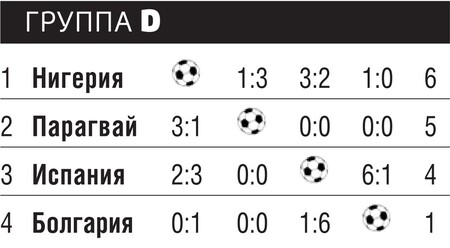 Сборная Испании, обладавшая сильным и сбалансированным составом, стала самой крупной потерей группового турнира. Первый же матч команды во Франции обернулся неудачей — сборная Нигерии поставила фавориту подножку. Происходившее напоминало лихо закрученный триллер: сначала на 73-й минуте матча глупейшая ошибка голкипера Субисарреты перечеркнула достигнутое испанцами преимущество, а затем Олисе нанес свой знаменитый по силе удар. Скорость мяча, пущенного африканским полузащитником, составила 116 км/час, и испанский голкипер просто не успел среагировать на этот «выстрел». Поскольку во втором матче испанцы не смогли взять штурмом возведенные Парагваем редуты, то разгром 6:1 утративших мотивацию болгар стал для них слабым утешением. А вот нигерийцы, досрочно вышедшие во второй раунд после минимальной победы над командой Стоичкова и Ко, в игре с Парагваем выглядели не столь грозно. Возможно, это было следствием семи замен, сделанных тренером Милутиновичем, который надеялся тем самым избежать лишних дисквалификаций и предоставить отдых лидерам команды. Как выяснилось чуть позднее, избранная стратегия африканцам не помогла.
