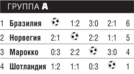 Действующие чемпионы мира начали турнир без особого блеска. Проблемы были хорошо заметны в линиях атаки и полузащиты, где футболисты никак не могли наладить взаимопонимание. Нападающий Роналдо, на которого возлаг лись особые надежды, к примеру, не замечал игравшего рядом Бебето. К концу группового турнира связи начали налаживаться, но тут бразильцам преподнесла неприятный сюрприз сборная Норвегии. Гол Бебето за 12 минут до конца матча успокоил южноамериканцев, и они не спеша стали дожидаться трели финального свистка. Скандинавы, которым терять было нечего, напротив, активизировались и смогли дважды огорчить бразильцев. Сначала отличился Туре Андре Флу, а затем Рекдаль реализовал довольно спорный 11-метровый, став в одночасье героем всей нации.