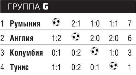 Главный претендент на первое место в группе — сборная Англии — для начала обыграла Тунис за счет точных ударов Алана Ширера и Пола Скоулза в концовках каждого тайма. Затем команда в ужасающем стиле провела матч против румынской команды, уступив сопернику во всех компонентах игры. Футболиста класса Георге Хаджи в составе англичан не нашлось, зато вышел на замену Майкл Оуэн, который тут же забил гол. В решающем матче с колумбийцами он появился на поле с первых минут, как и Дэвид Бекхэм, ставший автором одного из мячей. Тренер Ходдл ранее придерживал молодежь на скамейке запасных, считая, что играть должны опытные мастера. Но турнирная ситуация вынудила его бросить в бой все имевшиеся в распоряжении резервы.