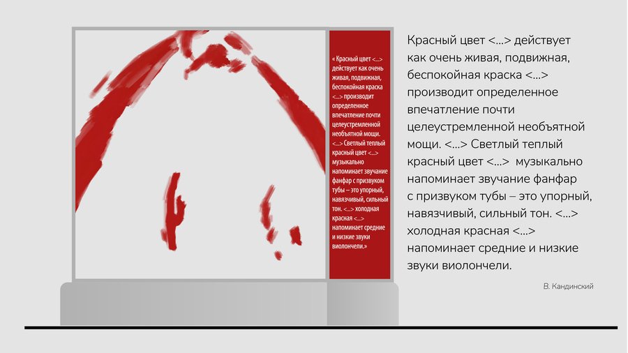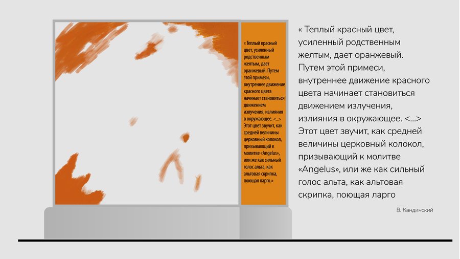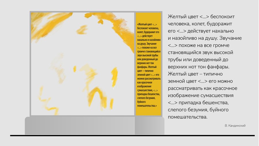 Используя теоретические выкладки из книги В. Кандинского «О духовном в искусстве» и технику живописи на стекле, можно превратить картину художника в пространственную инсталляцию, которая поможет наглядно продемонстрировать идеи художника, приведшие его к абстрактной живописи. Для этого можно «разобрать» картину на отдельные цвета-слои, сопроводив их цитатами художника, и выставить один за другим так, чтобы они собирались в целое изображение с одной, главной точки обзора, но при этом были самостоятельными объектами с других ракурсов. Каждый «слой» будет презентовать свой цвет сразу с нескольких сторон: абстрактное пятно собственно цвета, взятое из картины; цитата художника с описанием психологического воздействия этого цвета на зрителя; звук того инструмента, который у Кандинского ассоциировался с этим цветом.