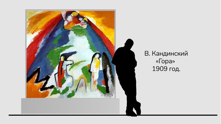 В своих теоретических трудах Кандинский раскрывает идейные основы своего подхода к работе с цветом и композицией. Особенно внимательно он разработал свою теорию цвета, подробно описывая психологическое воздействие каждой краски на зрителя и её связь со звуком. Через призму этих идей абстрактная живопись художника приобретает новое звучание и глубину. Познакомить зрителями с ними можно не только публикуя цитаты и хронологию событий, но и создавая инсталляции и видео-арты, которые помогут глубже прочувствовать идейные основы абстрактной живописи художника. Для примера была взята картина Кандинского «Гора» («Berg») 1909 года. Она является прекрасным примером переходного периода от предметного искусства к беспредметному через немецкий экспрессионизм. В ней ещё можно угадать реальные объекты: гору, голову лошади, силуэт всадника, здание на вершине горы, но, по сути, на картину нанесены яркие, экспрессивные пятна, которые приобретают самостоятельное значение, не привязанное к предметному миру. Цвет и форма получают в живописи Кандинского этого периода самоценность.