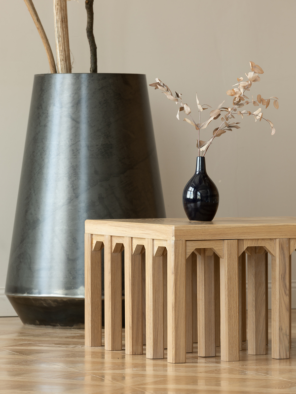 Форма основания журнального столика отсылает к колоннам швейной фабрики № 3, расположенной в центре Казани. Это здание играет роль архитектурной доминанты района и является одним из знаковых образцов советского модернизма города.
