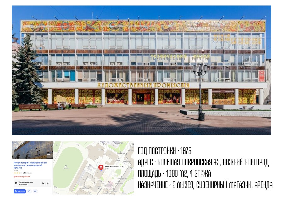 Дизайнерами разработана концепция полного обновления интерьера общественных зон здания Художественных Промыслов в г. Нижний Новгород. Главной задачей было создание современного, уникального и привлекательного пространства будущего для туристов и жителей города. На данный момент здание застыло во времени и требует инновационных и интересных решений, чтобы стать по-настоящему знаковым местом для города.