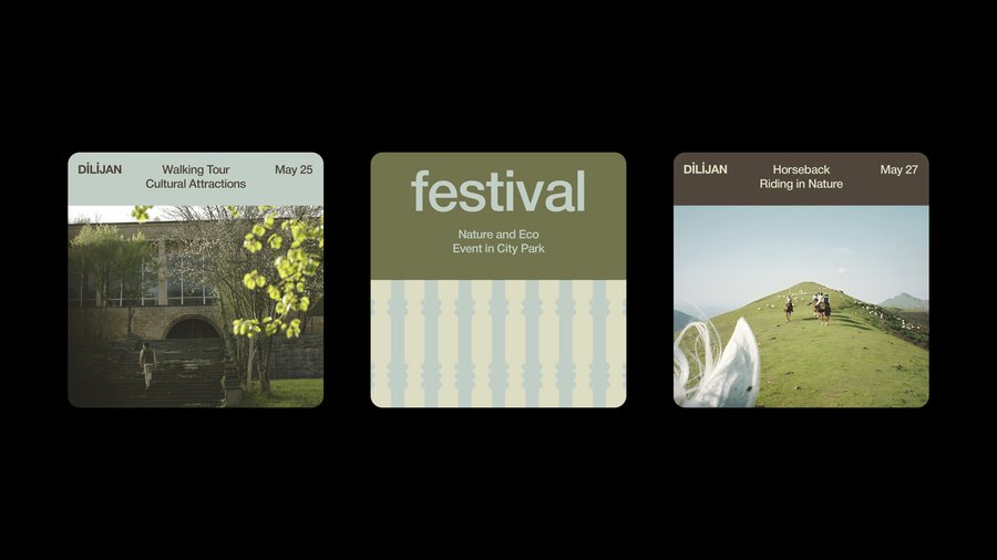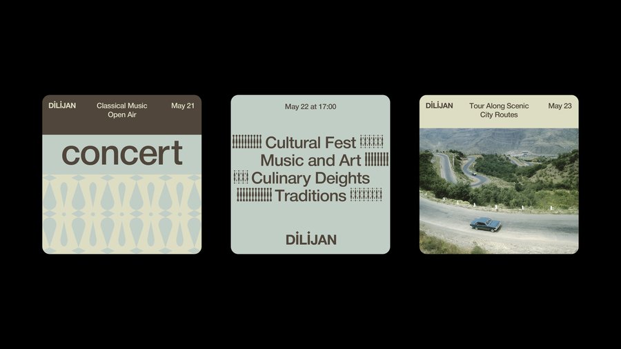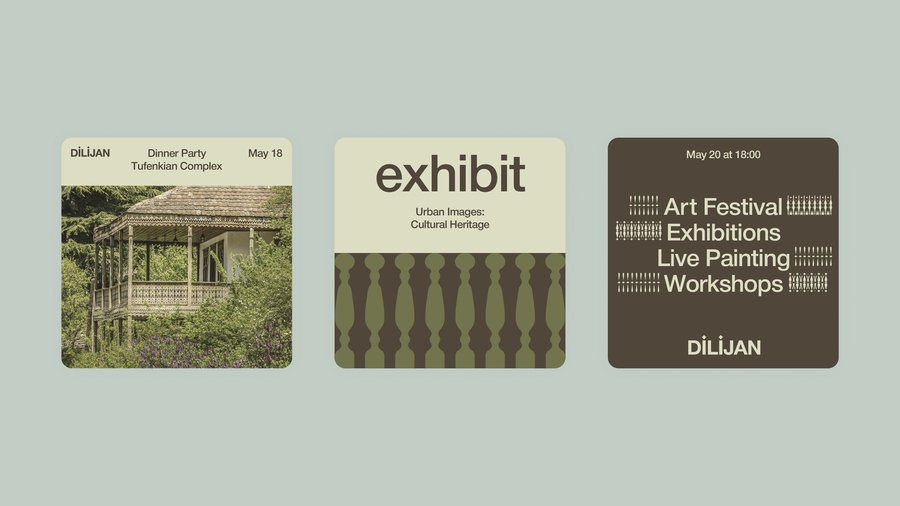 Метафора брендинга Дилижана выражается через балконы с резными узорами. Горизонтали стиля показывают многослойность города и объединяют его природные красоты и культурные традиции в единую панораму.