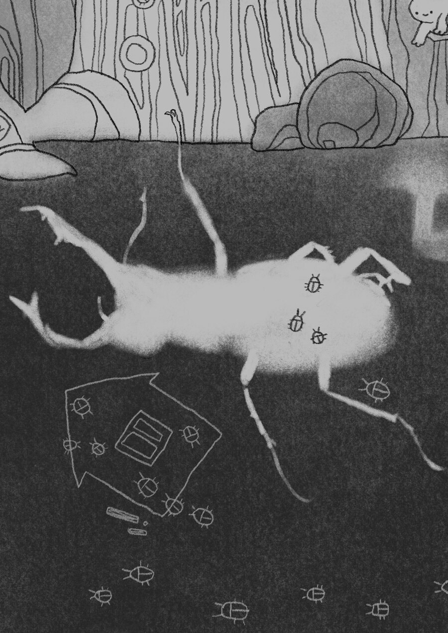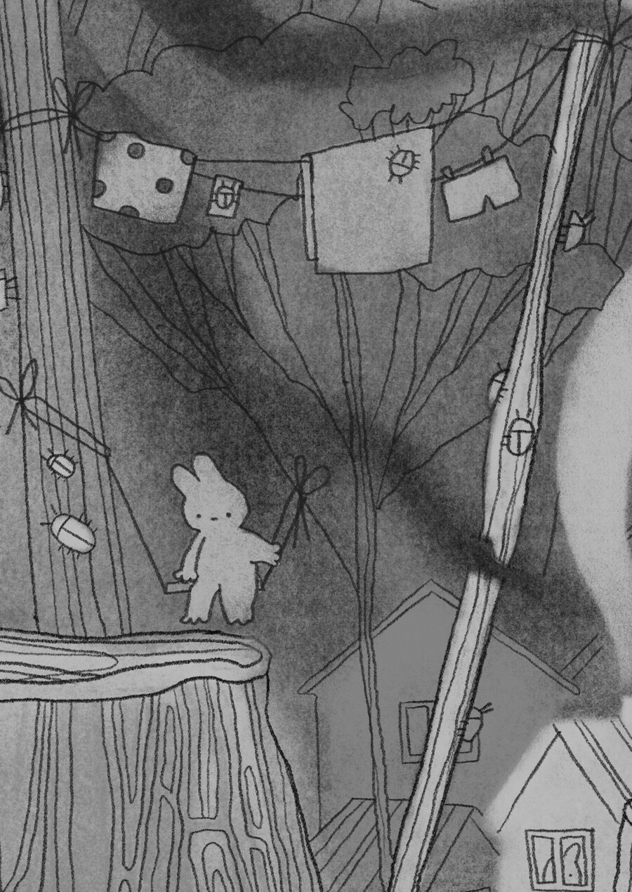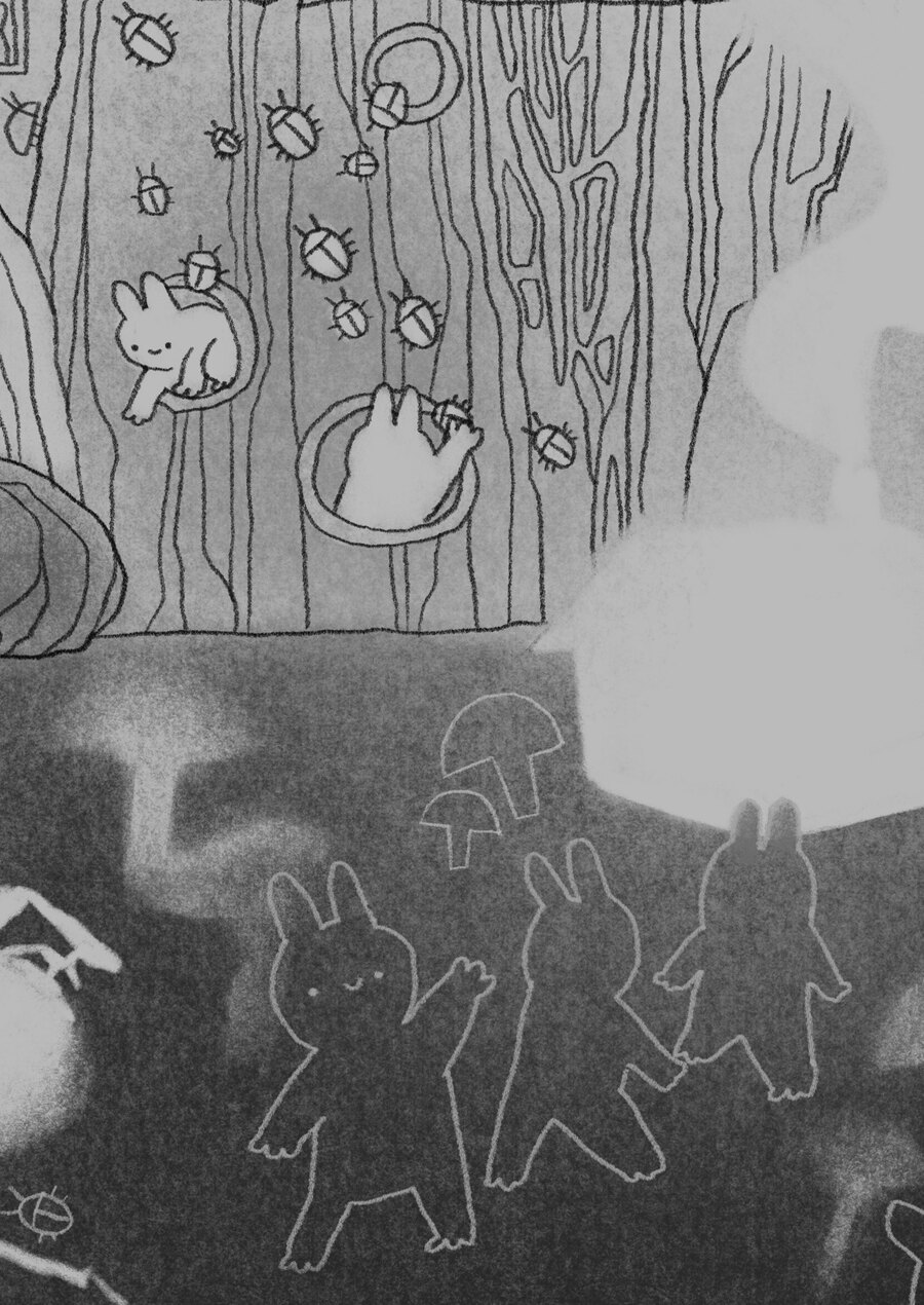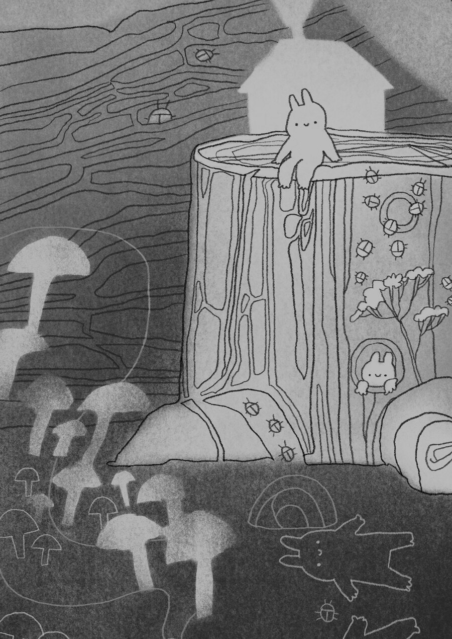 Исследование природы и её жителей через призму воображения и фантазии. В основе проекта лежит детализированная чёрно-белая иллюстрация, которая передаёт мир живой природы, населённый кроликами, жуками и пеньками, и показывает как они могут взаимодействовать, существовать и гармонировать между собой, будучи непривычно разных размеров относительно друг друга.