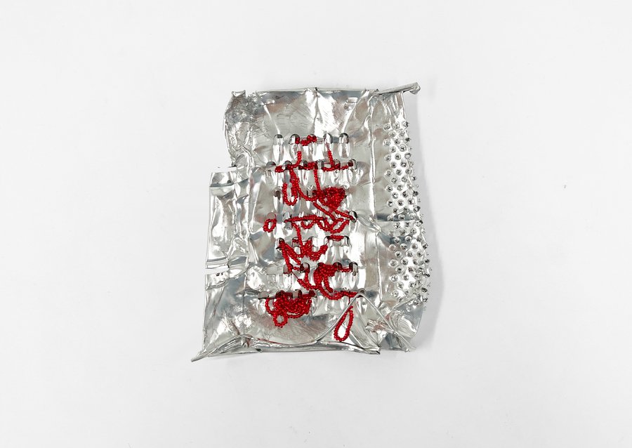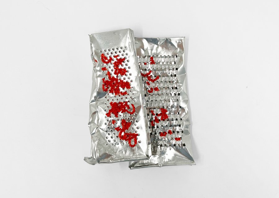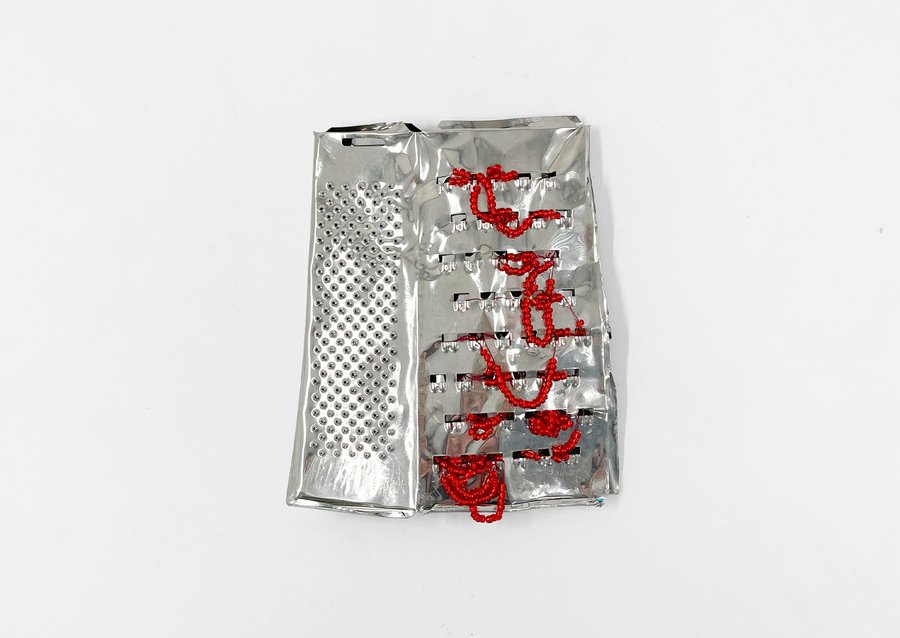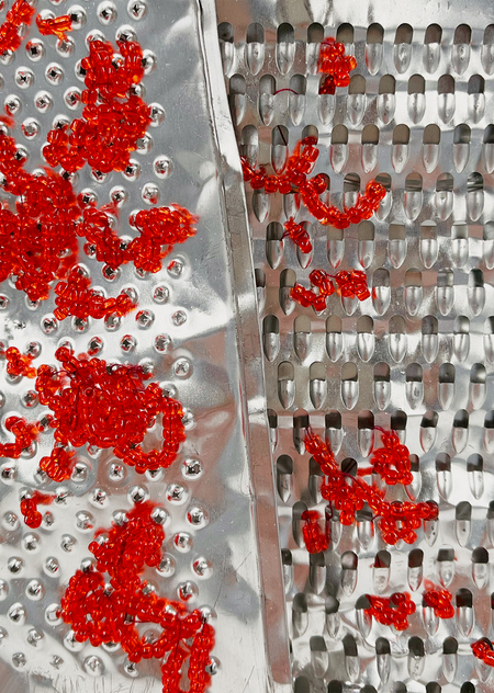 Графическая серия состоит из шести побитых терок, украшенных красным и розовым бисером. Эти бусины, с одной стороны, кажутся украшением, отражающем женское стремление сделать бытовые, неприглядные вещи красивее, а с другой стороны, напоминают капли крови, беспорядочно пробирающиеся через отверстия в покалеченной, измученной терке.