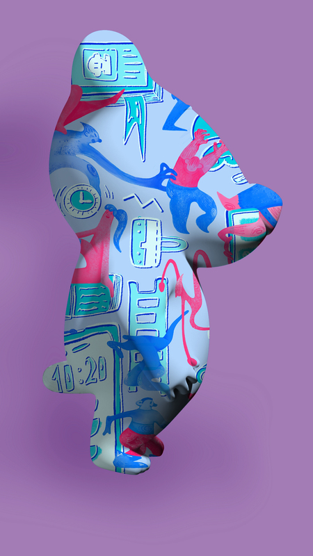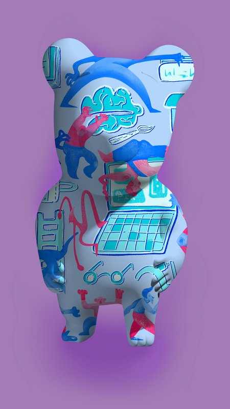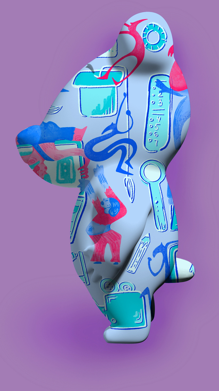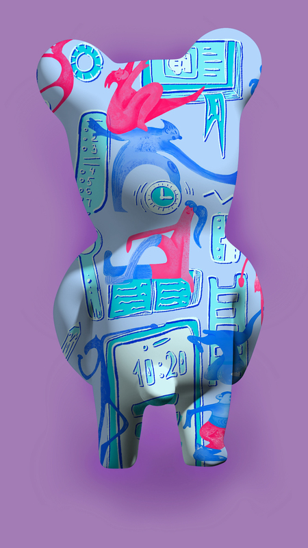 Детали также показывают связь современной молодежи с новыми технологиями. Мы все реже получаем тактильный опыт или находим информацию где-то помимо интернета. Поэтому в паттерн мне хотелось добавить наложений и прикосновений, чтобы показать, что знания можно ощущать и трогать, как в играх. (Эта идея также связана с осязаемостью фигурки Спотти).