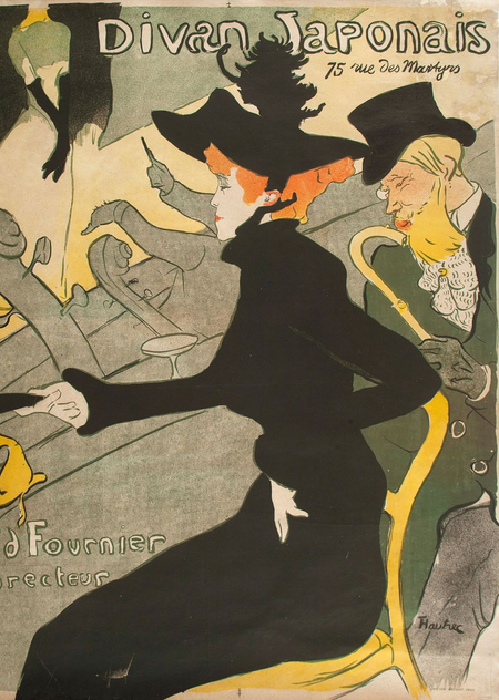 «Divan Japonais» («Диван Жапоне») было одним из многочисленных кабаре в Париже конца XIX века, которые часто посещал Тулуз-Лотрек. Его владелец Эдуард Фурнье заказал у Тулуз-Лотрека этот плакат с изображением певцов, танцовщиц и завсегдатаев, чтобы привлечь клиентов к открытию своего ночного клуба. На плакате, рекламирующем это ночное заведение, изображены две его любимые монмартрские звезды — Иветт Гильбер и Жанна Авриль. Здесь Авриль — зрительница, а не исполнительница, поскольку она сидит на переднем плане с Эдуаром Дюжарденом, писателем, завсегдатаем ночных клубов и другом Тулуз-Лотрека. В левом верхнем углу на сцене — силуэт Иветт Гильбер, узнаваемый по ее фирменным длинным черным перчаткам и худощавому телосложению.