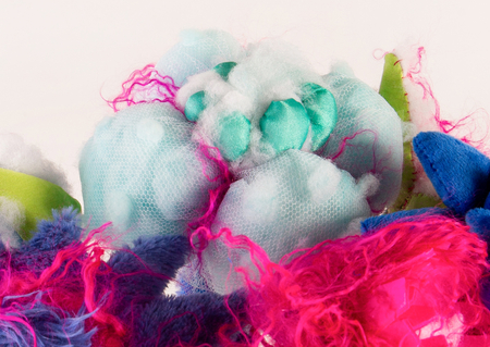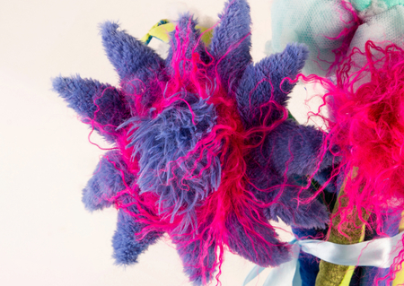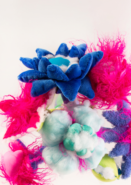 В процессе создания я опиралась на материалы с разной текстурой: мягкий мех, грубая ткань, пушистые волокна, шероховатые и гладкие поверхности. Их формы асимметричны, а края кажутся намеренно неряшливыми или грубыми, что придаёт каждому цветку свой уникальный характер. Цветовая палитра — насыщенные и контрастные оттенки розового, синего и зелёного — создаёт ощущение энергии и жизни.