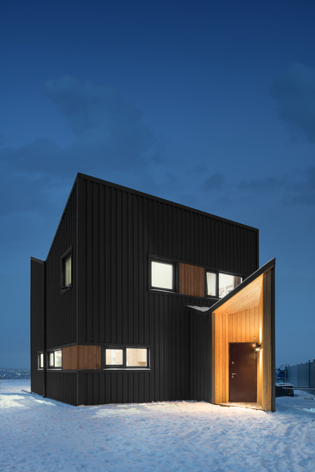 По словам архитекторов, для них дом стал попыткой переосмыслить наследие и опыт жилых ячеек Моисея Гинзбурга и интерпретировать в современном ключе идеи, лежащие в их основе, в условиях отдельно стоящего дома.Необычный силуэт здания — следствие не только необходимого градуса наклона крыши для сброса воды, но и отражение внутреннего содержания, в частности, функционально необходимых пространств для подъема по лестнице. Отделка фасадов изначально предполагалась недорогой, как и сам дом. Архитекторы усилили декоративные свойства профлиста за счет использования в отделке фасадов контрастного материала — лиственницы.Принципы коммунальной жилой ячейки 1920-х годов в этом доме гипертрофированны: полуторный высоты воздушный бассей гостинной визуально связан с развитой кухней-столовой и через лестницу — с приватной зоной второго уровня. Несмотря на то, что вход в дом четно артикулирован, выйти из него можно и со стороны столовой и гостиной.