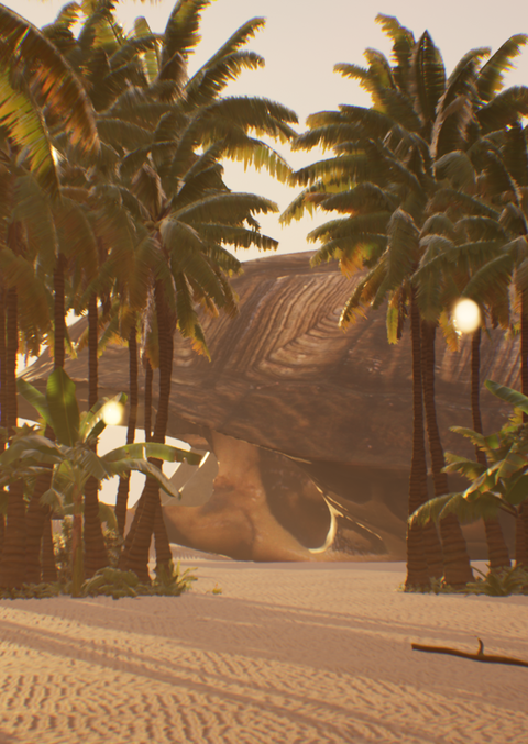 Задача пространства — рассказать цельную историю о «явлении» на пляже, для зрителя-игрока запланирован конкретный маршрут, а сцена собрана так, чтобы игрок точно прошелся по нему.