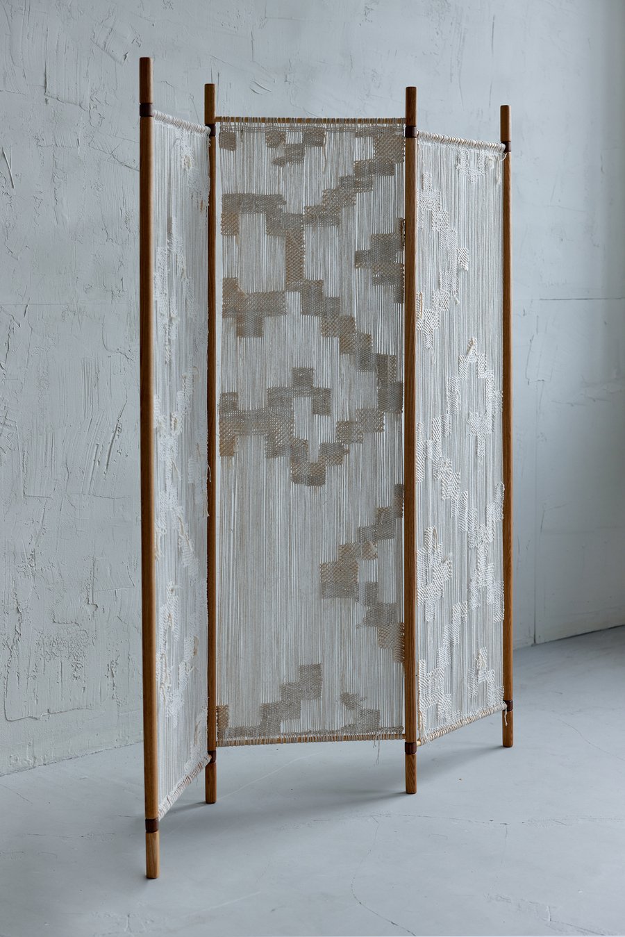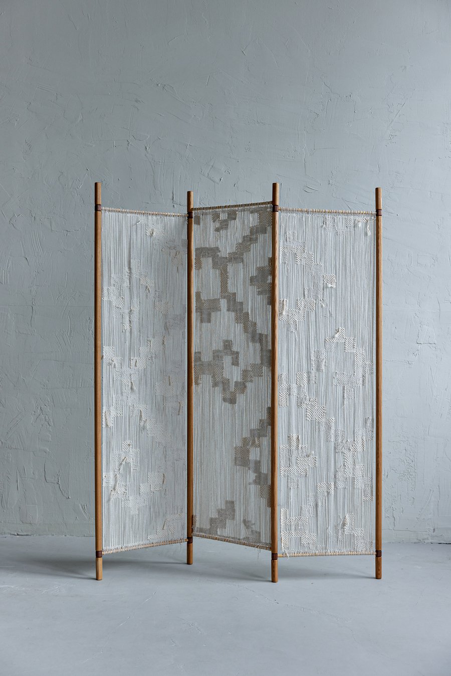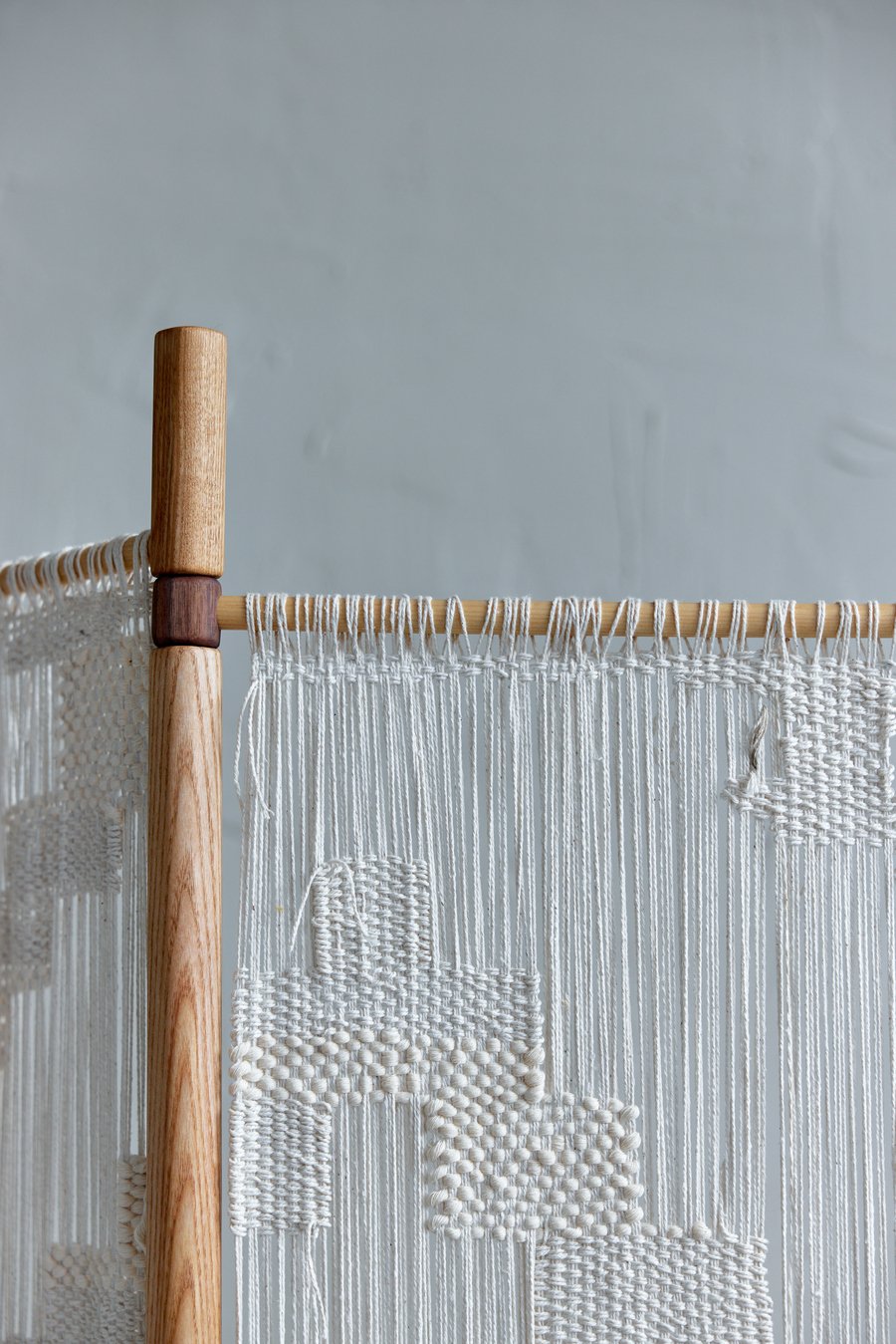 все элементы конструкции ширмы выполнены из массива дерева: стойки из ясеня, подвижные элементы — из американского ореха (он обеспечил необходимую жесткость и стал изюминкой конструкции). полотно соткано вручную из натуральной хлопковой неотбеленной пряжи разной толщины для создания фактуры.
